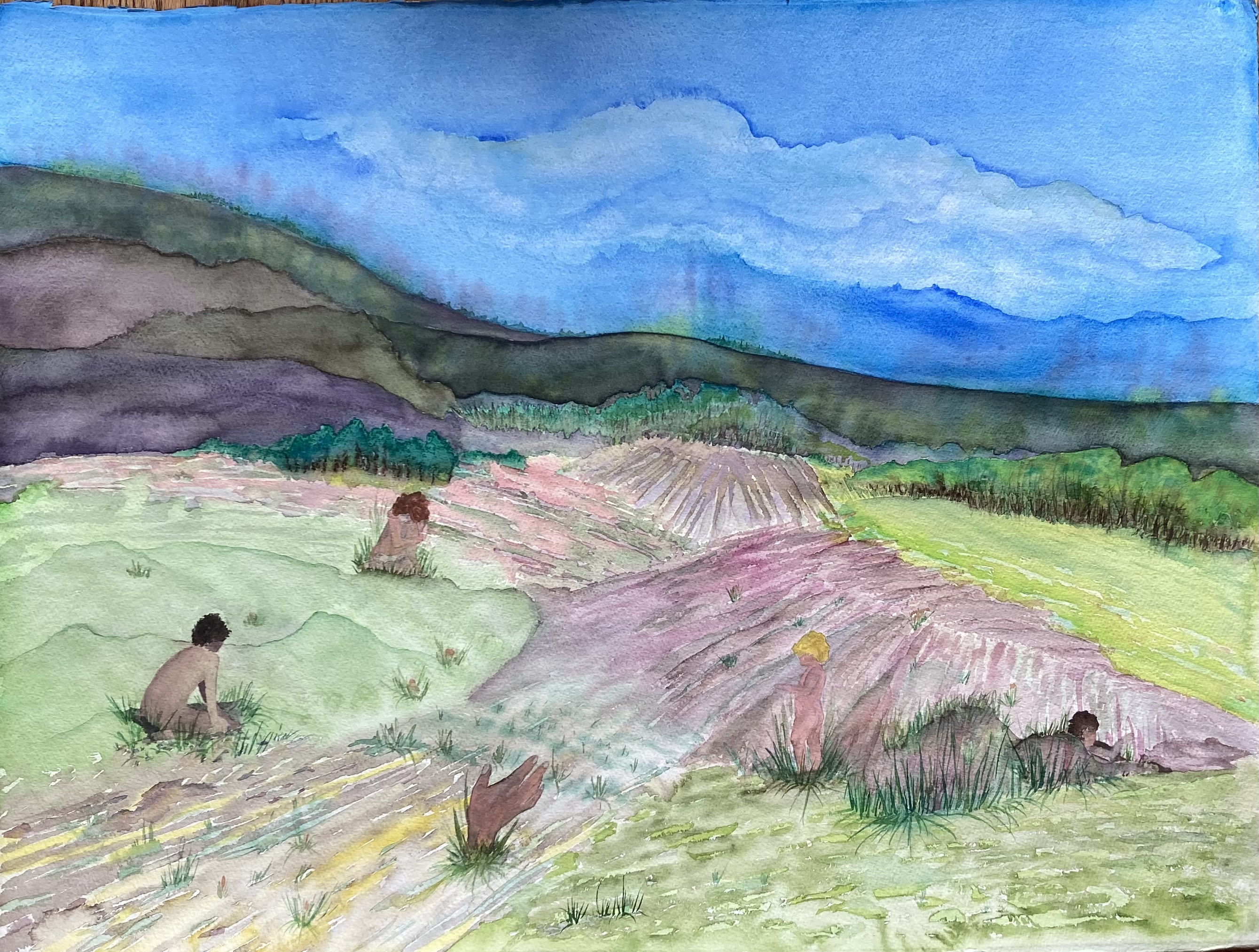 The time we are experiencing right now is, is in a word – surreal. And in playing with some new watercolors on a huge piece of paper I painted this image I see as we drive west through the rolling hills of northwestern Illinois – where farm fields meet huge beautiful skies. I imagine what it is like to be a farmer. And that you must nurture the seeds you plant to harvest anything.